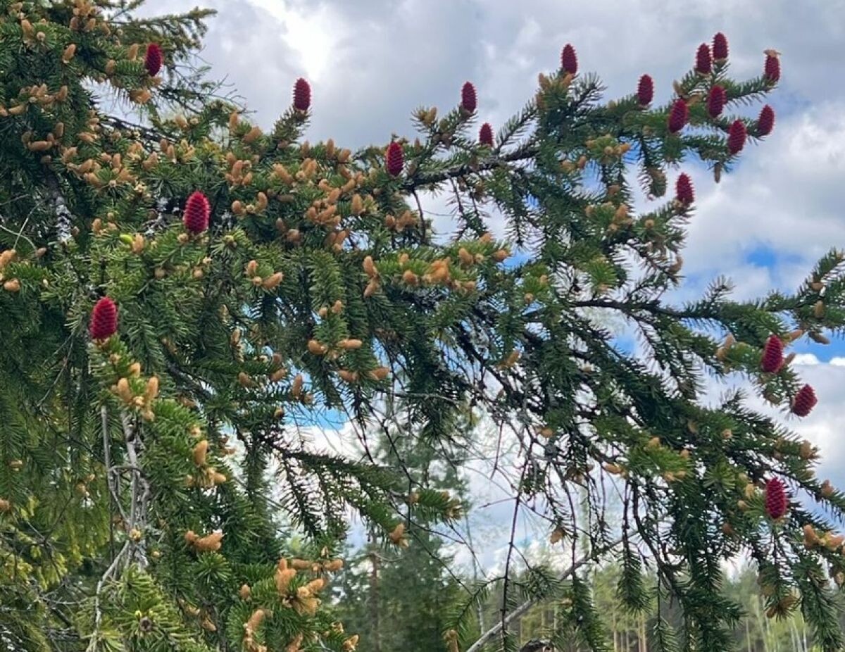 - "Самонаряжающиеся ели заметил наш инспектор отдела охраны во время рейда по ООПТ. Посмотрите, как красиво украшены деревья!" - поделились в дирекции. На самом деле, эти красные шишки - женские. Их чешуйки открыты и готовы принимать пыльцу. По-научному шишки голосеменных растений называются стробилы. Женские шишки — это мегастробилы. После опыления, постепенно красный цвет начинает изменяться на зеленый. Затем происходит процесс одревеснения, и шишка опять меняет цвет — уже на привычный нам коричневый. К осени формирование семени завершается, но ель не торопится избавиться от семян — чешуи шишек раскроются зимой или в начале весны, когда образуется наст. Это время удобно тем, что легкие крылатые семена скользят по насту и ветром перемещаются на большие расстояния. Животные (например, белки) тоже способствуют переносу, однако строение семени больше приспособлено к перемещению с помощью ветра
