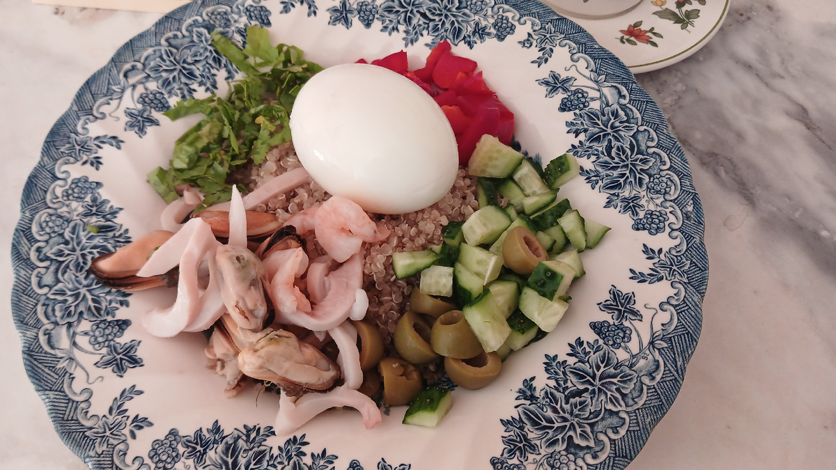 На завтрак сегодня боул с морепродуктами. Боул с киноа, и к крупе добавила оливки, огурцы, болгарский перец, кинзу и яйцо, заправила ложечкой кунжутного масла И к кофе были конфеты Ореховое пралине На обед сварила куриный супчик с овсянкой, а в качестве салата/второго блюда -свекла с селедкой После обеда еще на десерт кофе с творожной запеканкой и конфетой На ужин сегодня, как и вчера, лагман с говядиной Меню год назад Еда в дорогу: завтраки, обеды, ужины и перекусы