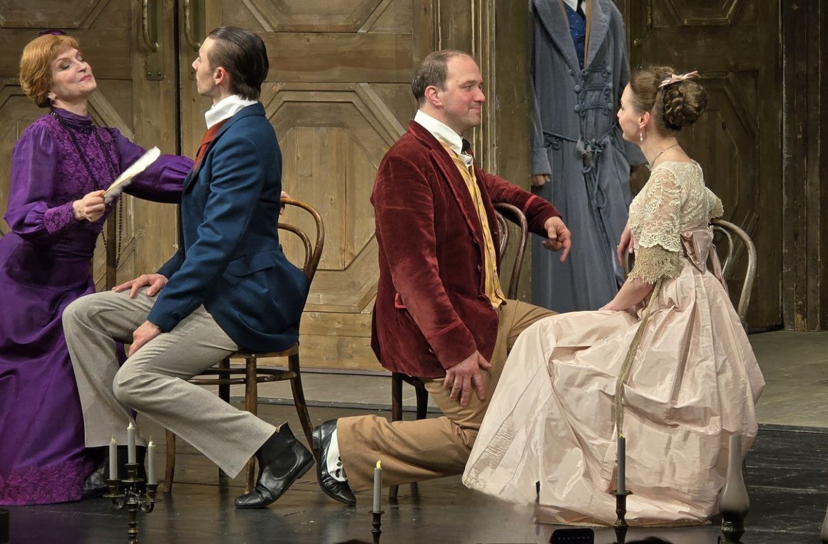 Декорации минимальны и не меняются. На сцене установлены десятка два огромных дверей, которые открывались и закрывались с приходом и уходом героев. Основные действия происходят в доме Потапа Потапыча Каркунова (Михаил Янушкевич) . И лишь одна сцена представляет собой диалог Веры Филипповны (сегодня её сыграла заслуженная артистка Мария Скосырева) с Ерастом (Фёдор Урекин) в храме. Те же огромные двери, но молитва Веры Филипповны и свечи дали понять нам о месте действия.