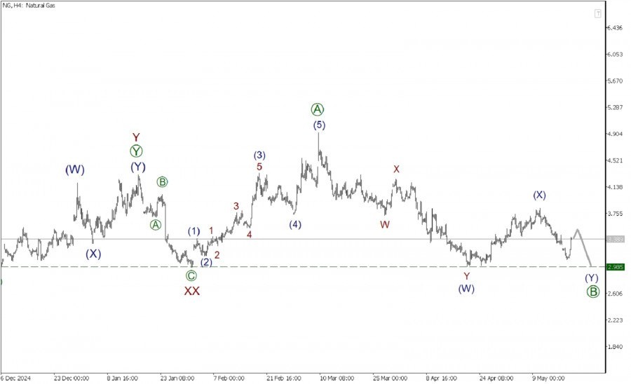 https://basechop.ru/wordpress/?p=43402 По Газу в глобальной перспективе формируется крупный коррекционный тренд. На текущем графике представлена разметка большой действующей волны (Y), принимающей форму тройного зигзага W-X-Y-XX-Z. На текущем графике мы видим, что действующая волна Z похожа на стандартный зигзаг, внутри которого завершен импульс [A]. Сейчас может формироваться коррекционная подволна [B], которая, судя по всему, принимает форму двойного зигзага (W)-(X)-(Y). Предполагается, что первые две части указанного зигзага уже завершены, то есть имеется ввиду действующая волна (W) и противодействующая волна связка (X). В настоящее время на последнем участке графика может строиться медвежья финальная подволна (Y). Предполагается, что цена может упасть в область предыдущего минимума 2.98. На указанной отметке ранее была завершена действующая подволна (W) и волна связка (XX). В текущей ситуации можно рассматривать открытие коротких позиций. Торговые рекомендации: Sell 3.38, …