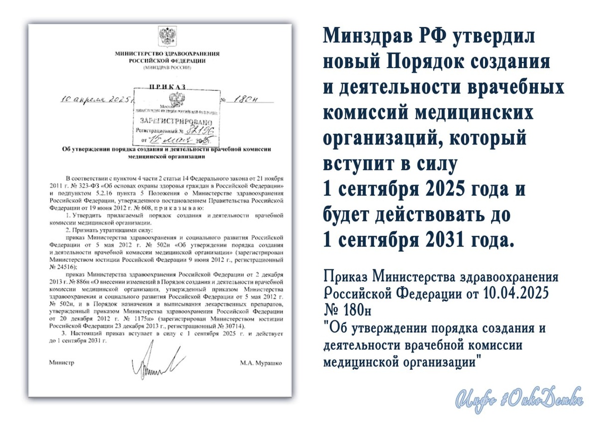 Минздрав РФ утвердил новый Порядок создания и деятельности врачебных комиссий медицинских организаций, который вступит в силу 1 сентября 2025 года и будет действовать в течение шести лет, до 1 сентября 2031 года. Новый документ заменит действующий Приказ Министерства здравоохранения и социального развития РФ № 502н от 5 мая 2012 года и значительно расширяет функционал врачебных комиссий. 📃 Приказ Министерства здравоохранения Российской Федерации от 10.04.2025 № 180н "Об утверждении порядка создания и деятельности врачебной комиссии медицинской организации" В обновленном порядке определены цели создания врачебных комиссий, включающие постоянное совершенствование организации медицинской помощи, внедрение системы менеджмента качества, организационно-методическое сопровождение лечебно-диагностического процесса, рациональное использование времени пациента и медработника, обеспечение комфортных условий для предоставления медуслуг, а также методическое сопровождение внедрения и развития ме