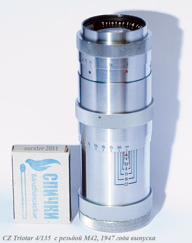 Объектив Triotar 4/135 1947 года, попал ко мне на профилактику с налётом на минусовой линзе и тугим ходом фокусера. Было интересно изучить конструктивные особенности этого почтенного экземпляра. Наружные кольца и детали оправы изготовлены из никелированной латуни, вследствие чего объектив довольно увесист. Для такого фокусного расстояния он очень длинный – почти как 150 мм объектив. Оптическая схема Триплет, разработки конца 19-го века. Довольно толстая передняя линза. Диафрагма, состоящая из шестнадцати матированных лепестков, всегда будет давать пятна рассеяния в виде ровного кружка. У этой, ранней, версии оправы только одно кольцо диафрагмы без предварительной установки. По картинке Triotar оказался близок к Индустарам (оптическая схема Тессар). К недостаткам объектива я могу отнести слишком длинную посадочную резьбу из-за чего объектив можно навернуть до посадочной плоскости только на чёрный Арсеналовский переходник КП-42/Н, у которого нет полки для штырька толкателя и приклейки чи