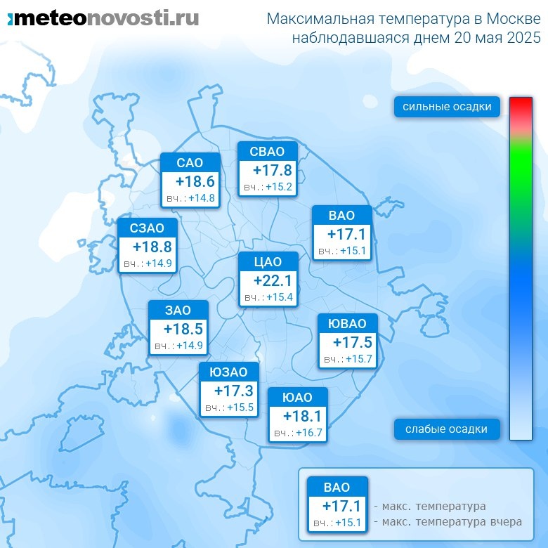 #за12часов #день Прошедший день 20 мая был на 1.5°C теплее вчерашнего. Максимальная температура днём в Москве оказалась на 2.2°C ниже нормы, что в пределах обычных значений. Самая высокая температура +22.1°C была зафиксирована в 17 часов в центре города, а холоднее всего было на востоке: +15.5°C. Разница по максимальной температуре в разных частях столицы составила за день целых 6.6°C. Максимальные порывы ветра днём достигали 6 м/с. Атмосферное давление за день не изменилось и составило 737 мм.рт.ст. Было без существенных осадков Самый теплый день в Москве 20 мая был в 1897 году, когда максимальная температура составила +29.7°C, а холодный в 1974 году: +2.6°C. Перейти на сайт Прогноз погоды на 14 дней