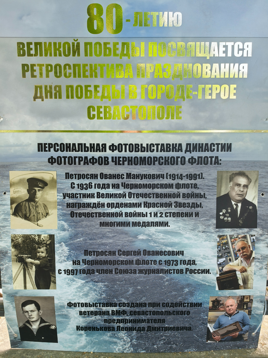 В этой статье посмотрим фотографии, которые покажут нам, как в разные годы Севастополь отмечал День Победы. Также на выставке представлены старые фотографии Севастополя. Ну что, давайте посмотрим выставку? Статья написана автором канала не Дзен «Прогулки по Севастополю». Копирование или использование материалов без согласования с автором запрещены. Выставка находится рядом с Владимирским собором. Сколько она будет длиться? Сложно ответить на этот вопрос. Но, по моим наблюдениям, выставки здесь проходят долго. Работы размещены на внешней ограде собора. Когда появляется новая выставка, то старые плакаты просто перевешивают на ограду с другой стороны собора. Сначала нас знакомят с авторами фотографий: Возможно, позже у вас возникнут вопросы, т.к. на выставке будут не только заявленные фото с празднования Дня Победы. Начинается она с плакатов военных лет: Первыми показаны фотографии 1945 года: Здесь можно рассмотреть как выглядел временный памятник Ленину (сейчас на этом месте ус