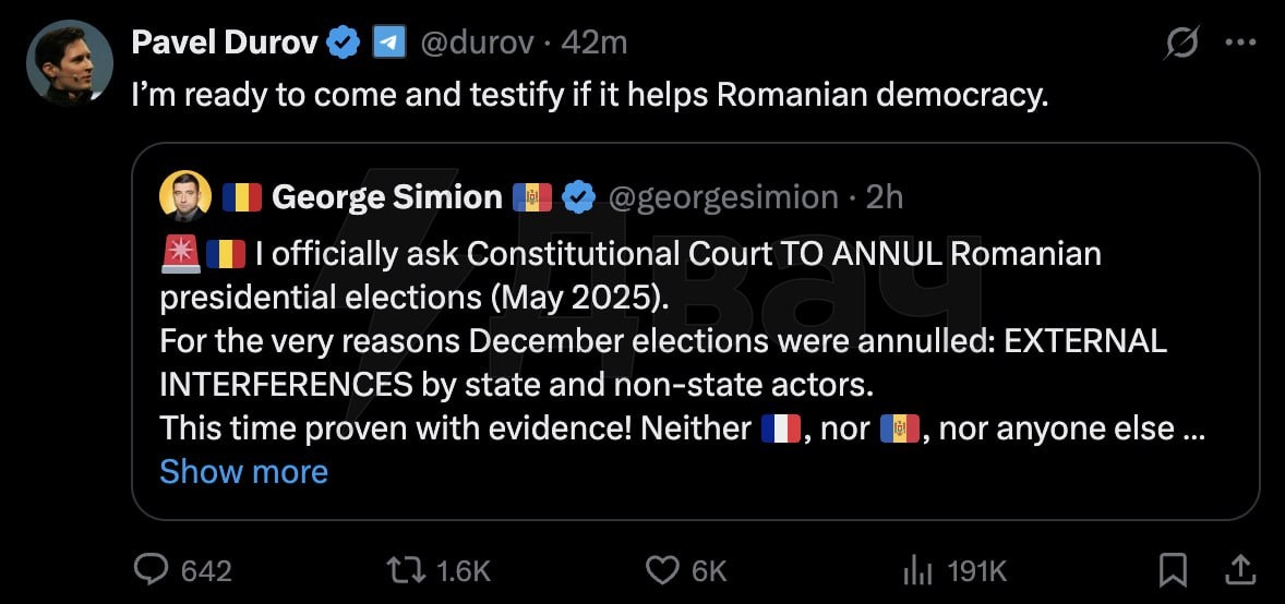 Durov posts that he will come to Romania to testify on FOREIGN INTERFERENCE in elections, especially by France and Moldova