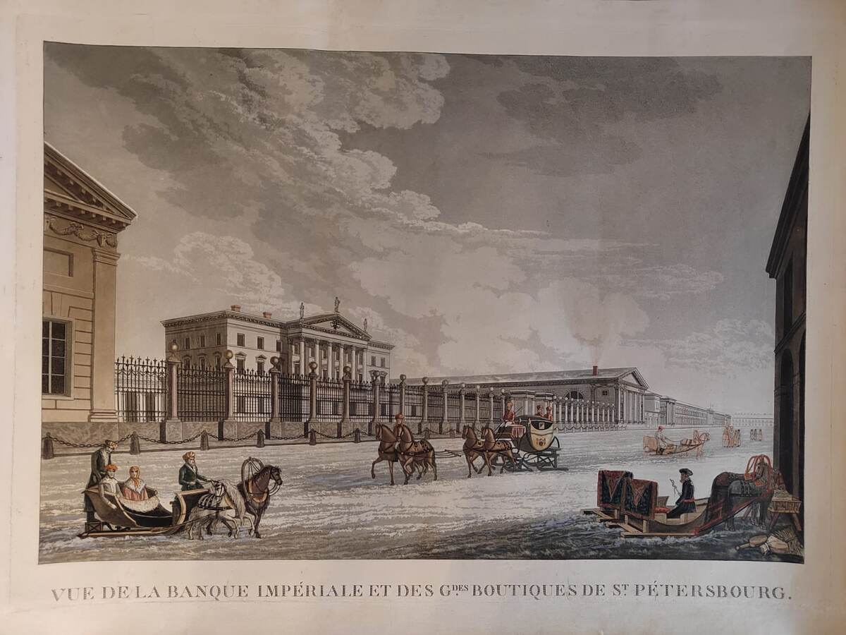 Гравюра из серии 12 видов Санкт-Петербурга. "Вид на Императорский банк". По рисункам М.Ф. Дамам-Демартре (работал в России с 1792 по 1805 гг.). Граверы Кларк и Дюбург. Лондон, 1815 год. Императорский банк располагался на Садовой 21, где сейчас расположен Экономический университет (ФИНЭК). Размер 48х65 см., веленевая бумага, акватинта с медной доски. С акварельной подкраской времен издания. Великолепный подарок людям причастным к банковской деятельности, особенно к ЦБ - приямому наследнику Государственного ассигационного банка. Цена 700.000 р.