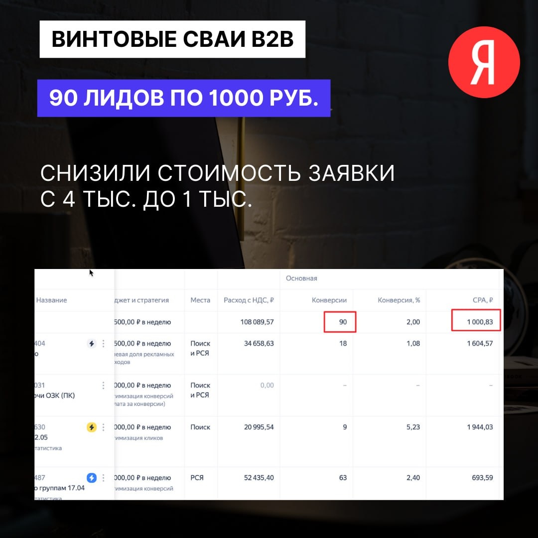 Промежуточный результат в новом проекте b2b винтовые сваи оптом. Льем трафик из яндекс директ. За месяц 90 лидов по 1000 руб. Работает поиск, рся и мк. Подключили коллтрекинг. Пред подрядчик приводил лиды по 4 тыс. Если нужна окупаемая реклама для вашего бизнеса, напишите мне любым удобным способом. Проведу бесплатный аудит и составлю стратегию продвижения.