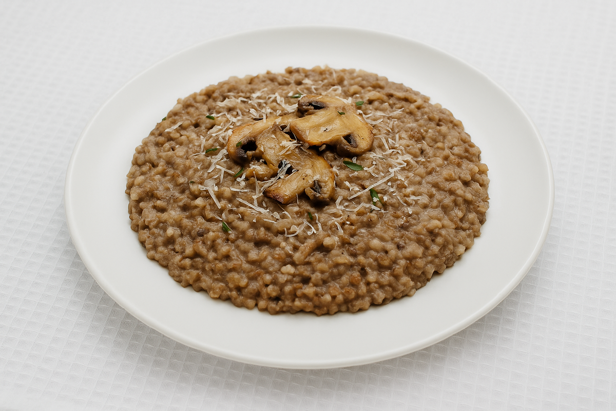 Если ты думал, что гречка — это исключительно «варим в пакетике и подаём с котлетой», то знай: она умеет больше. Гречотто — это тот случай, когда простая крупа неожиданно превращается в кремовое, сытное блюдо, от которого потом ещё и в тарелке соус вымакивают. Технология — как у ризотто: жидкость добавляется порциями, а в финале — сыр, сливки и волшебство. Только вместо риса — родная греча, а вместо пафоса — уютный домашний ужин, который хочется повторить. 1. Всё подготовить. Гречку промываем, лук чистим, грибы моем. Сковороду берём побольше — будем в ней и жарить, и тушить. 2. Делаем основу. На смеси сливочного и растительного масла обжариваем мелко нарезанный лук до мягкости — не жарим, а томим. Добавляем нарезанную грудинку — пару минут, чтобы пошёл аромат. Следом — шампиньоны, порезанные тонко. Обжариваем, пока не испарится лишняя влага и не появится лёгкий румянец. 3. Вводим гречку. Высыпаем её прямо в сковороду. Перемешали — и начинаем вливать воду поэтапно: по полстакана. Залива