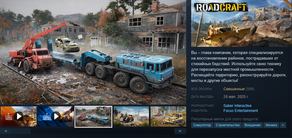 Пиковый онлайн с момента релиза (24 часа) составляет: 30к. Упрощение механик: прогресс или шаг назад? Главным камнем преткновения стали радикальные изменения в геймплее. В отличие от SnowRunner, где игроки балансировали между планированием маршрутов, заправкой и ремонтом, RoadCraft отказалась от ключевых элементов: Многие игроки видят в этом стремление разработчиков привлечь казуальную аудиторию, пожертвовав сложностью. «Это уже не симулятор, а песочница с игрушечными машинками», — пишет пользователь на форуме. Демо-версия игры, доступная с февраля 2025 года,