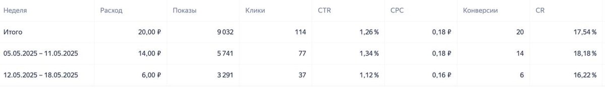 Рекламная кампания демонстрировала хорошие показатели конверсии, особенно на первой неделе. Однако на второй неделе произошло существенное снижение активности, что привело к резкому падению показов, кликов и, как следствие, конверсий. Это снижение, скорее всего, обусловлено уменьшением бюджета или изменением стратегии на вторую неделю.