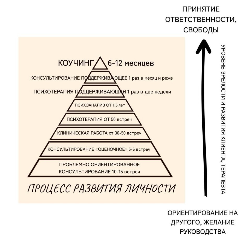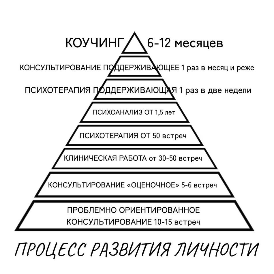 Составила список целостного процесса развития личности, с точки зрения практикующего психолога, немного опишу его. Проблемно ориентированное консультирование. На сейчас является одним из входов в терапию. 10-15 встреч. Нацелено на: тренинг навыка (например пройти интервью на работу), разрешить небольшой конфликт, разобраться в каком-то контексте межличностно взаимодействия и/или контексте ситуации. Консультирование «оценочное» 5-6 встреч (10-15), также является входом в терапию. Служит для: выявления паттернов, мотивации клиента, структурной организации, возможностей и ограничений терапевта в работе с данным запросом. Клиническая работа от 30-50 встреч. Для этого вопроса мы учимся на клинических психологов, работа идёт совместно с врачом психиатром. Мы работаем с внутри личностным планом и внешним миром так же как и в психотерапевтическом направлении, но держа в голове акцент диагноза. Психотерапия от 50 встреч, также внутриличностный план и внешний мир. Психотерапия уже лечение, как и