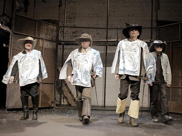 В мае побывал в театре Около Дома Станиславского — смотрел «Трёх мушкетёров» по Дюма. Да-да, те самые (и очень любимые мной): Атос, Портос, Арамис, и, конечно, Д’Артаньян. Но если ждёте мюзикл с мантиями, клинками и песнями "Пора, пора, порадуемся..." — не туда попали. Постановка отсылает нас в атмосферу СССР: когда мальчишки бегали во дворе с палками (такие вот шпаги были), а книжки про мушкетёров зачитывались до дыр. И это, пожалуй, главное обаяние спектакля. Визуально и по духу — почти самодеятельный театр (вначале ощущение, что смотришь школьную постановку, но это не так, понимание всей глубины мысли и картинки режиссера Юрия Погребничко приходит в процессе. Он, кстати, сам был в театре). Все сделано с таким вкусом, теплотой и юмором, что к середине действия ты уже полностью внутри этой стилизованной истории. Музыка здесь — отдельный герой: живая гитара, клавиши, аккордеон, актёры поют вживую. Звучат песни Кикабидзе, и это мгновенно возвращает в эпоху советского кино, где мушкетёры