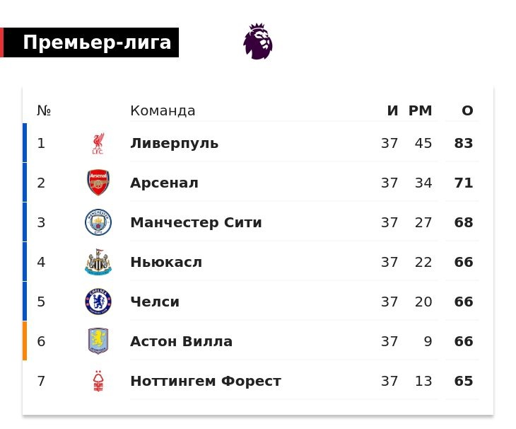 Команда тренера Пепа Гвардиолы победила «Борнмут» (3:1) на своем поле в 37-м туре. Досрочно ставший чемпионом «Ливерпуль» (83 очка) и занимающий второе место «Арсенал» (71) уже гарантировали себе участие в Лиге чемпионов-2025/26 на общем этапе. В ЛЧ попадут еще три команды, которые войдут в топ-5 по итогам 38-го тура. «Ман Сити» идет 3-м, имея 68 баллов (разница голов «+27»). Далее расположились «Ньюкасл», «Челси» и «Астон Вилла». У трех команд по 66 баллов после 37 матчей, при равенстве очков первый показатель – разница голов. У «сорок» она лучше – «+22», у лондонцев – «+20», у бирмингемцев – «+9». 7-е место занимает «Ноттингем Форест» (65 очков, разница голов «+13»). В заключительном туре «Фулхэм» примет «Манчестер Сити», «Манчестер Юнайтед» – «Астон Виллу», «Ньюкасл» встретится с «Эвертоном», «Ноттингем Форест» – с «Челси», а «Арсенал», который еще может упустить вторую строчку, на выезде сыграет с уже вылетевшим «Саутгемптоном». Напомним, еще одно место в Лиге чемпионов от Англии п