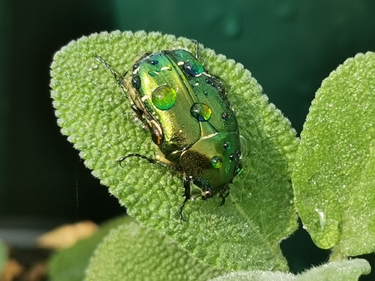 Пошел лет бронзовок. В полете их слышно издалека по характерному звуку. А вот на рассаду перед поливом зря села) Теперь сиди и сохни! Бронзовки у меня живут в компосте, писала про них тут:
