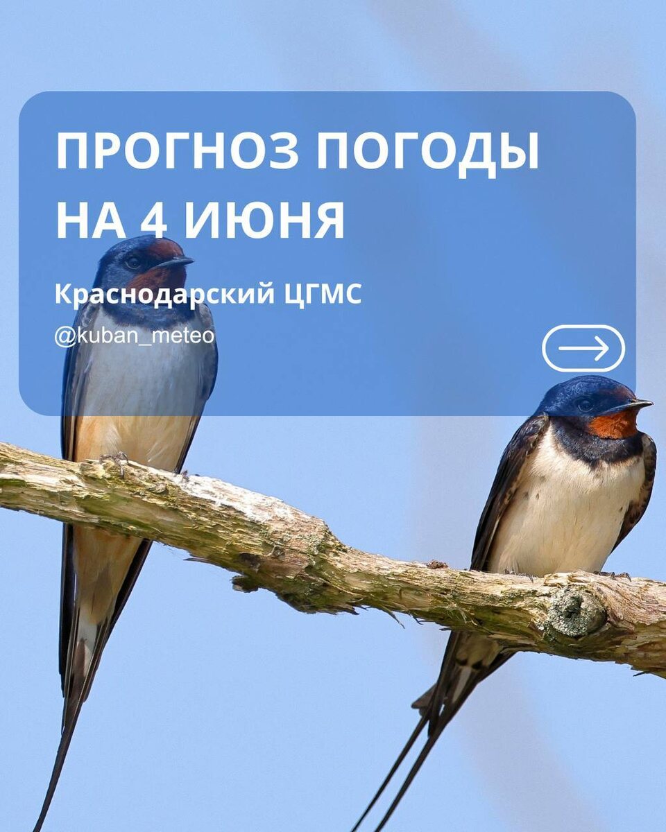 🌤️ Прогноз погоды в Краснодарском крае на 4 июня. 🌊 На Черноморском побережье: Переменная облачность. Без осадков. 💨 Ветер: • Ночью/утром: северо-западный, северный. • Днем: южный, юго-западный 6-11 м/с. • Местами порывы до 13 м/с. 🌡️ Температура: ночью 13…18°, днем 21…26°. Прогноз от @kuban_meteo