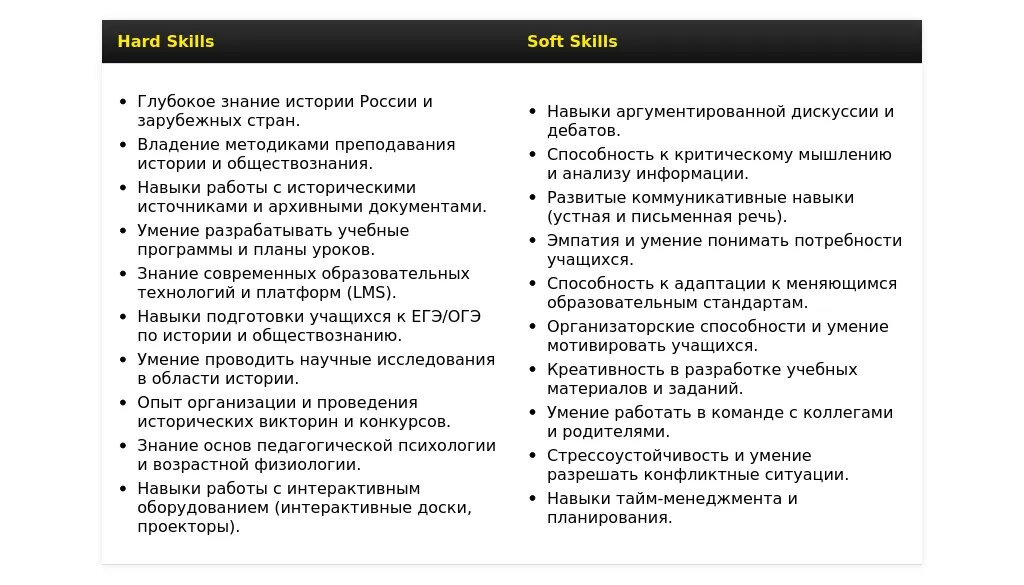 "Профессиональные навыки: знание истории, знание обществознания, *владение интерактивной доской*, *использование онлайн-платформ для обучения*. Методические навыки: разработка уроков с использованием современных образовательных технологий, организация проектной деятельности учащихся. Личностные качества: коммуникабельность, ответственность, креативность."
