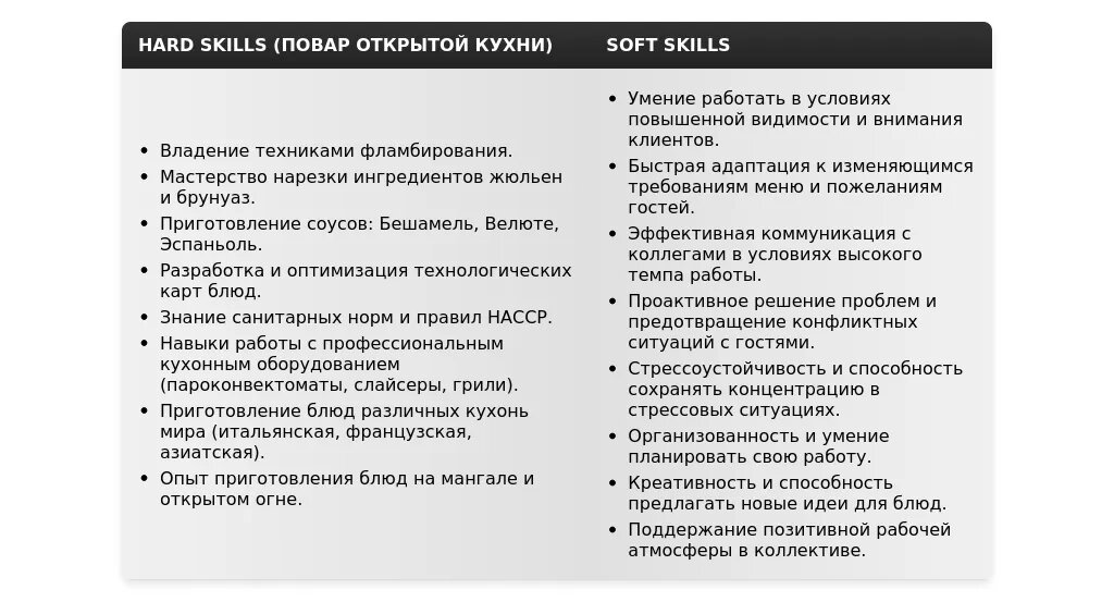 - Универсал: "Приготовление горячих блюд", "Приготовление холодных блюд", "Знание европейской и русской кухни", "Работа с различными видами продуктов", "Умение работать в команде".