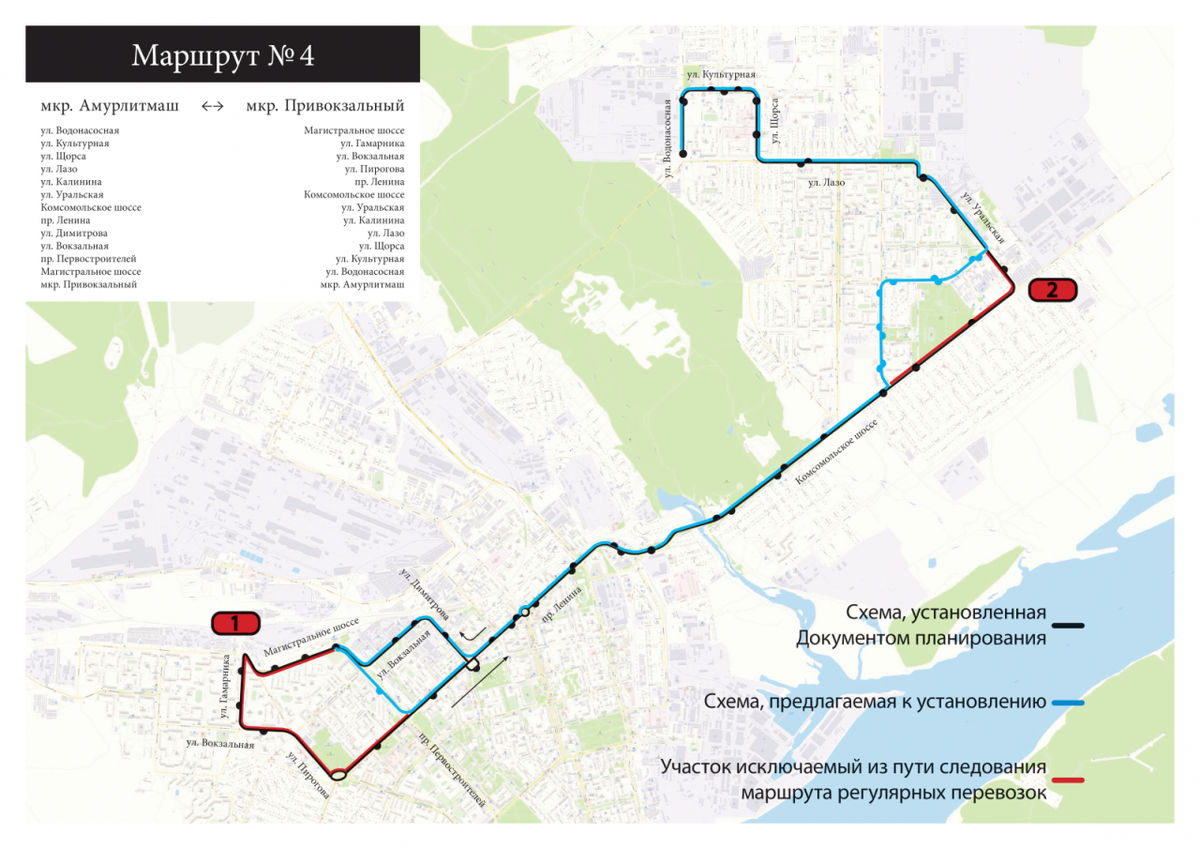 - вариант № 2: ул. Станционная – ул. Юбилейная – ул. Дикопольцева – пр. Ленина – ул. Гамарника – ул. Лесная – ул. Комсомольская – пр. Первостроителей – пр. Ленина – пр. Мира – ул. Красногвардейская – ул. Кирова.