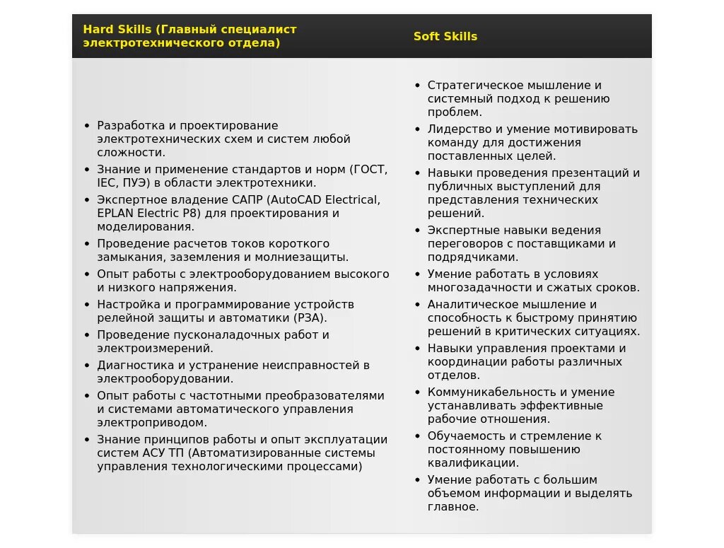- Как показать свою ценность для компании: Подчеркните свой вклад в повышение эффективности работы электротехнического отдела, снижение затрат, повышение безопасности и надежности электроснабжения.