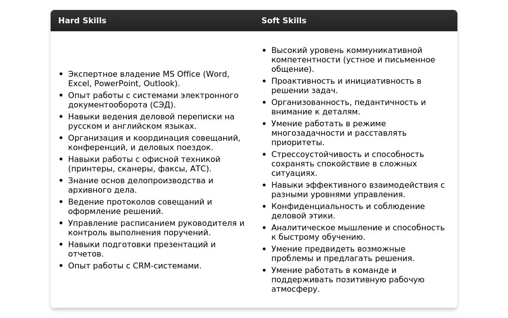 - Акцент на качества и навыки: Обратите внимание на организационные навыки, внимательность к деталям, грамотную речь, знание делового этикета, умение работать с оргтехникой и программным обеспечением.