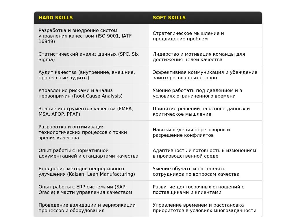- Для вакансий в производственных компаниях: "ISO 9001", "статистический контроль процессов", "бережливое производство", "анализ коренных причин", "управление рисками", "входной контроль".