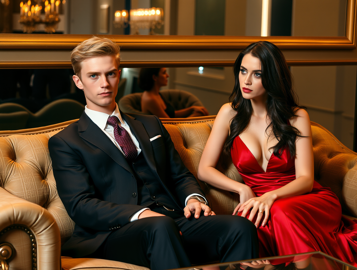 Он садится в дальнем кресле. Без слов. Просто жестом приглашает её — будто бы разрешает, но на самом деле ждёт. Как дирижёр, который знает, что сейчас зазвучит его любимая симфония. Он откидывается назад, кладёт руки на подлокотники и смотрит спокойно, внимательно, не отрывая взгляда, будто старается запомнить каждую деталь момента.