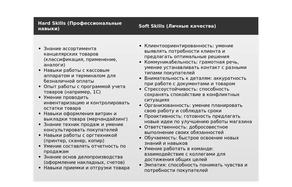 Ключевые навыки, релевантные для должности (например, навыки продаж, знание ассортимента, работа с кассой).