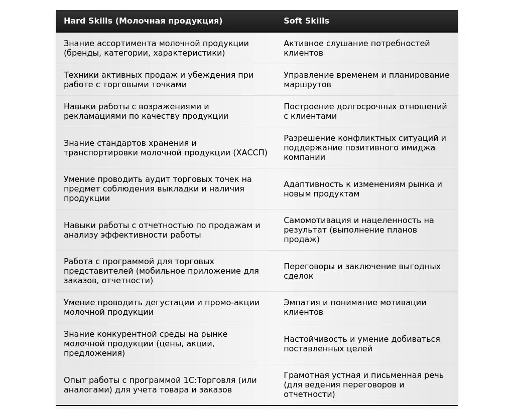 - Обязательная информация:Ключевые навыки и компетенции, релевантные для позиции торгового представителя в молочной отрасли.