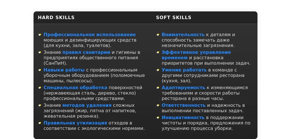 - Уборщик-посудомойщик: "Мытье посуды (вручную и в посудомоечной машине)", "Уборка кухни", "Вынос мусора", "Поддержание чистоты и порядка на рабочем месте".