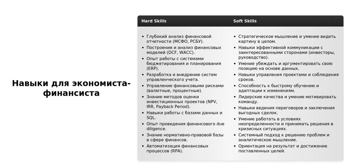 - Разделите навыки на категории: Например, "Финансовый анализ", "Бюджетирование", "Управление рисками", "Программное обеспечение".