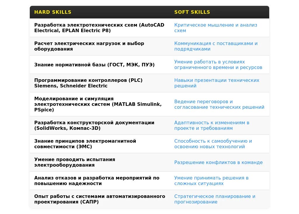 Ключевые навыки и компетенции, релевантные для позиции инженера-конструктора по электрооборудованию.