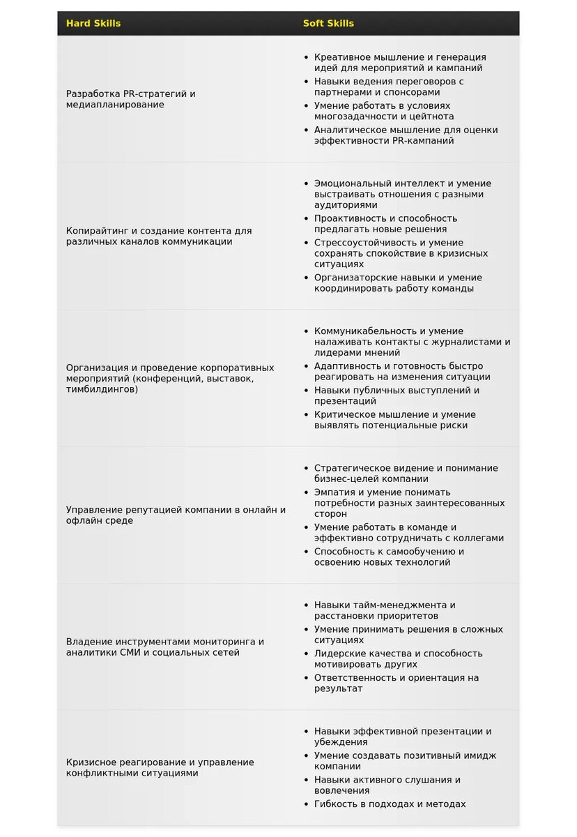- PR-менеджер: "Управление репутацией", "Работа со СМИ", "Продвижение бренда", "Разработка PR-стратегии", "Кризисное реагирование".