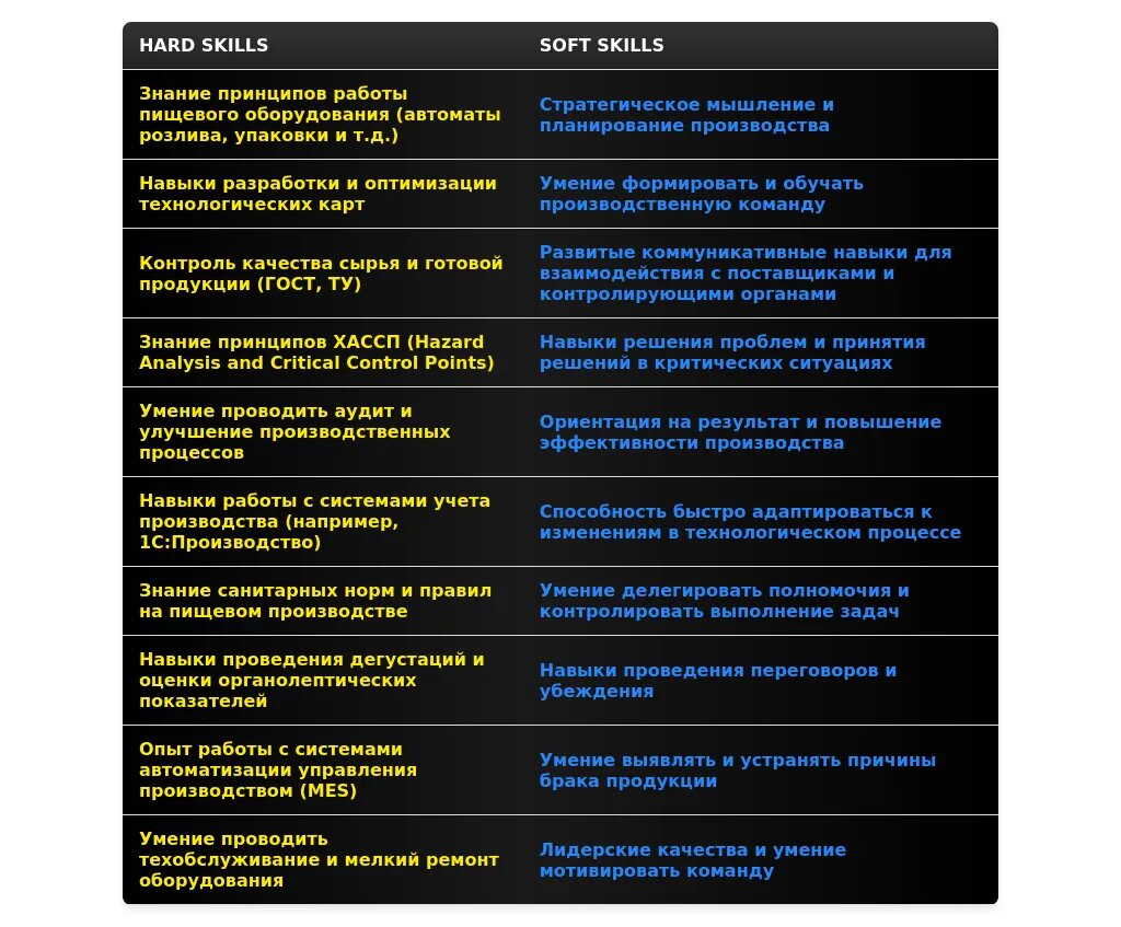 Разделите навыки на профессиональные (hard skills) и личные (soft skills). Профессиональные навыки должны быть конкретными и измеримыми (например, "Знание системы HACCP", "Опыт работы с оборудованием для пастеризации"). Личные навыки должны демонстрировать ваши качества как сотрудника (например, "Ответственность", "Умение работать в команде", "Коммуникабельность").