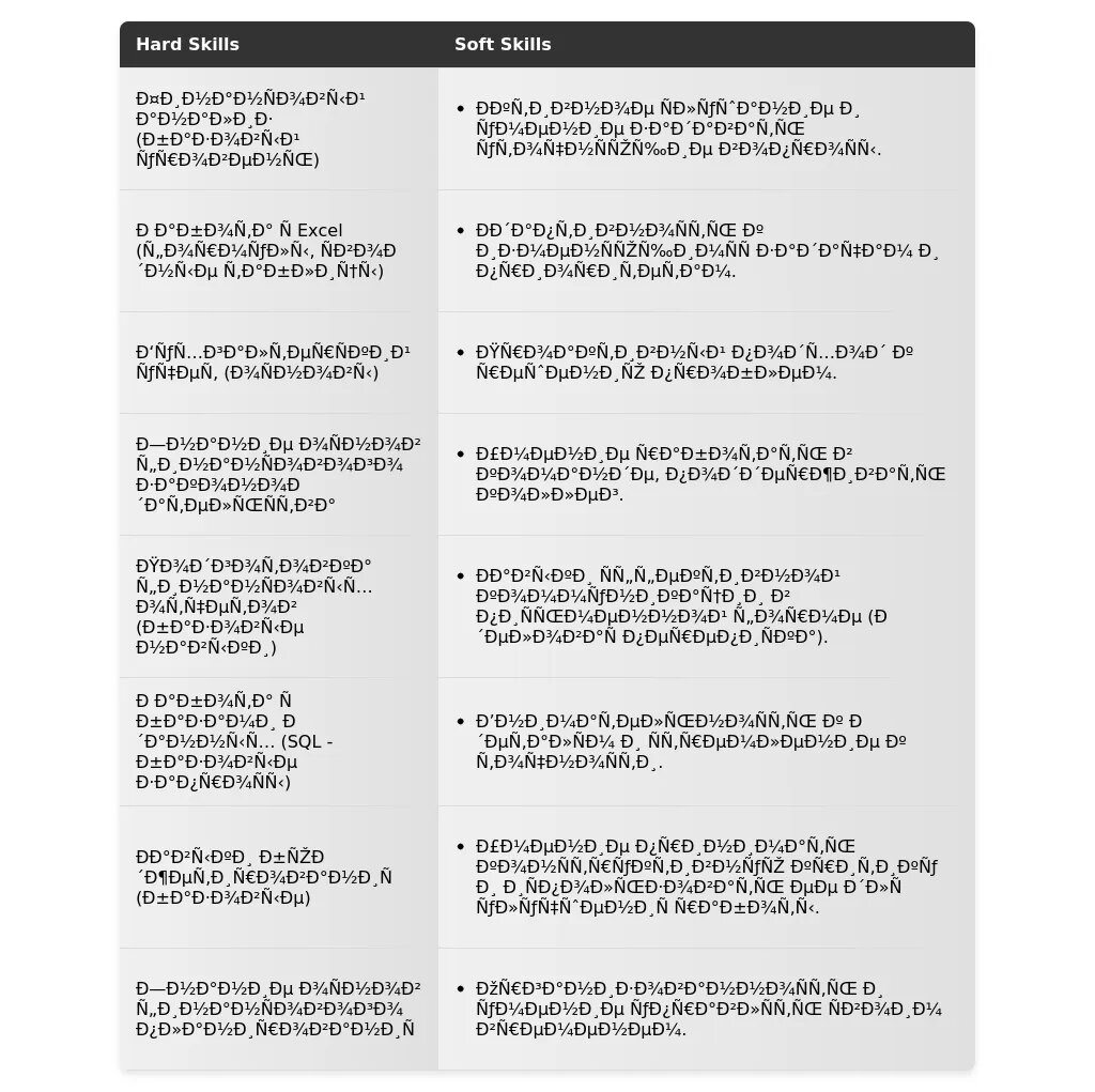- Для вакансий, требующих аналитических навыков: "Аналитический склад ума", "Опыт анализа данных", "Выявление закономерностей и тенденций", "Разработка рекомендаций на основе анализа данных".