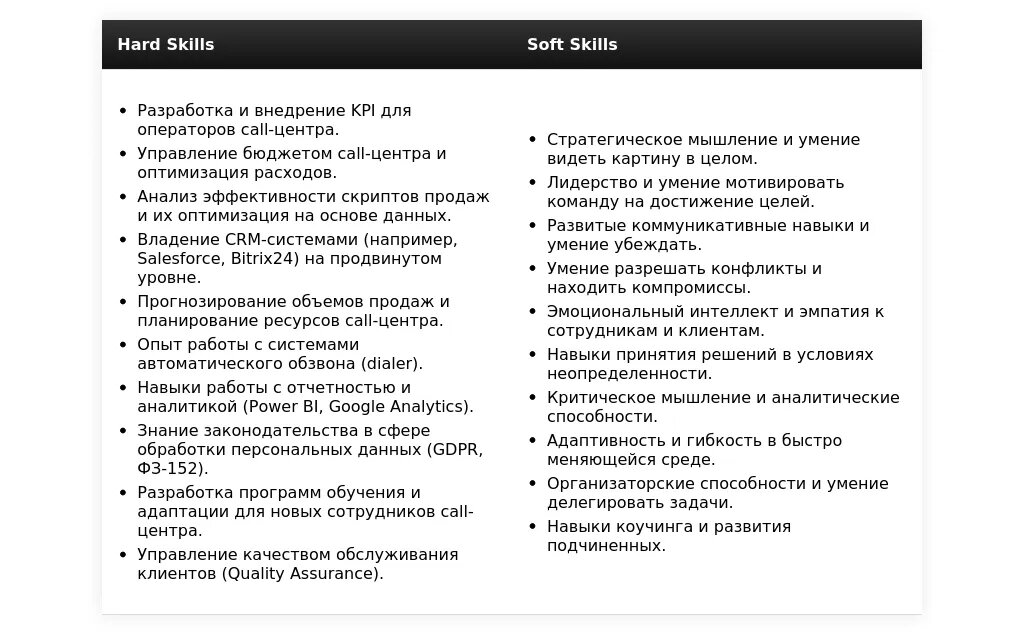 "Управленческие навыки: Управление call-центром (50+ операторов), разработка скриптов продаж, обучение персонала. Навыки продаж: Продажа банковских продуктов, работа с возражениями, обслуживание клиентов. Личные качества: Стрессоустойчивость, работа в условиях строгой регламентации."