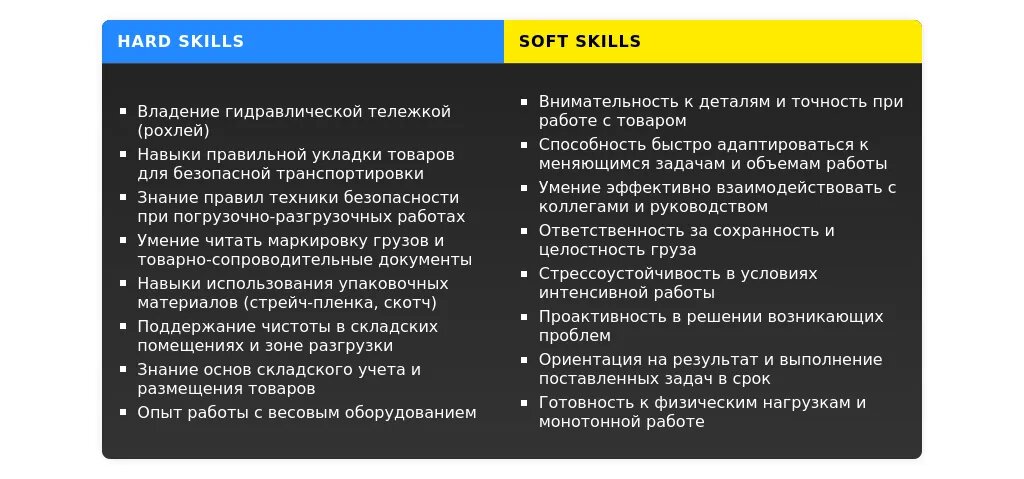 - Скрытые: Внимательность к деталям, умение планировать погрузку, чтобы товар не повредился.