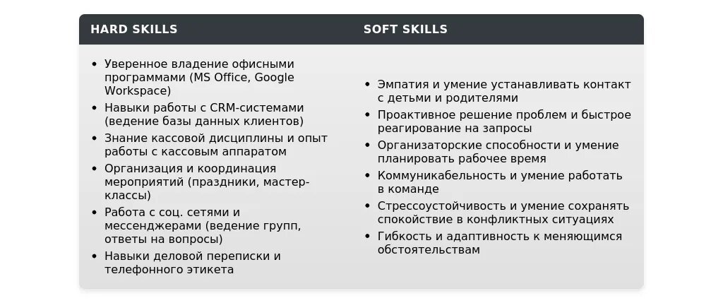 Организационные навыки: Организация мероприятий, планирование, координация работы персонала. Коммуникативные навыки: Общение с детьми и родителями, разрешение конфликтных ситуаций, ведение переговоров. Навыки работы с ПК: MS Office (Word, Excel), работа с CRM-системами, знание кассовой дисциплины.