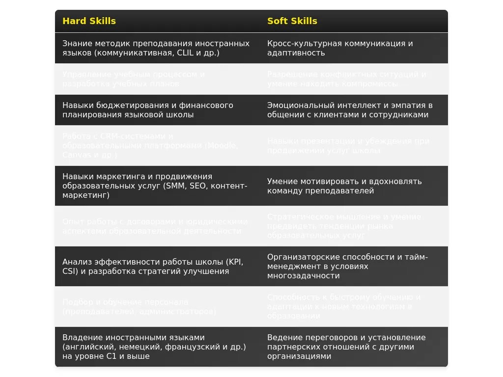 - Профессиональные навыки: Навыки, связанные с конкретной профессией (например, преподавание английского языка, управление продажами).