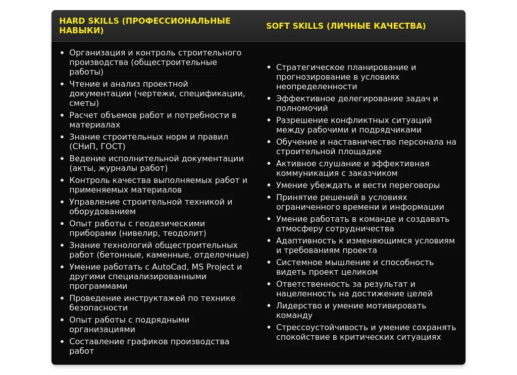 - Строительство жилых комплексов: "руководство бригадой", "контроль качества", "соблюдение сроков", "работа с проектной документацией", "взаимодействие с заказчиком".