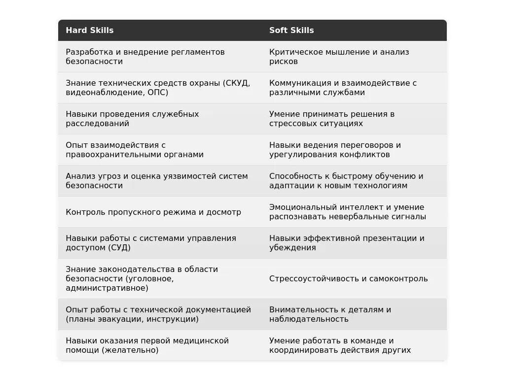 - На какие качества и навыки делать акцент: Внимательность, ответственность, стрессоустойчивость, наблюдательность, умение работать в команде, знание основ законодательства в области безопасности.
