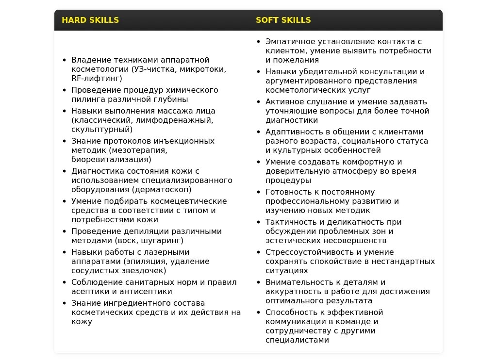 - Для вакансий в спа-салонах: "Владение техниками массажа лица", "Знание уходовых процедур для разных типов кожи", "Создание расслабляющей атмосферы".