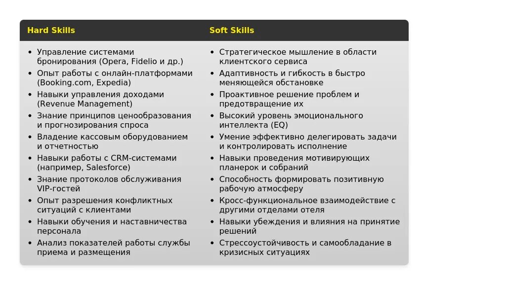 - Для вакансий в гостиничном бизнесе: "Управление бронированиями", "Работа с программой Opera PMS", "Обслуживание VIP-гостей", "Разрешение конфликтных ситуаций", "Обучение новых сотрудников".