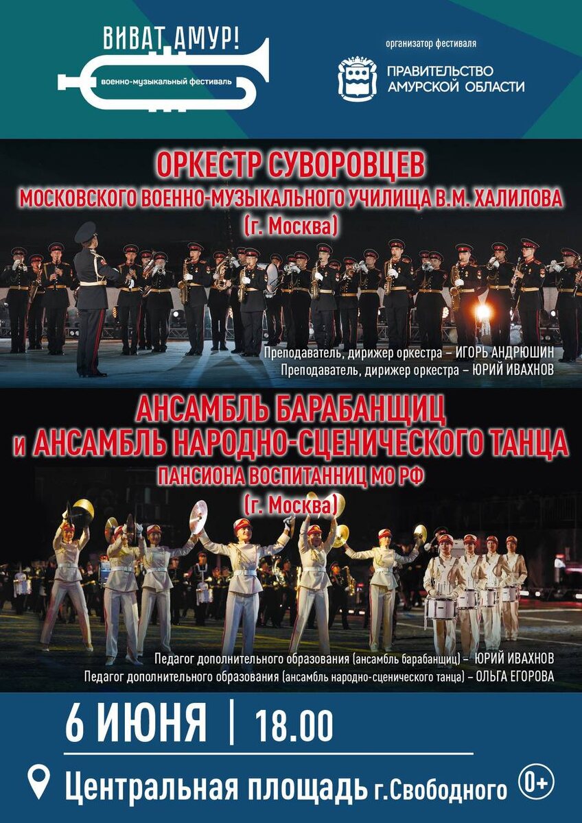 6 июня Свободный встречает Оркестр Суворовцев Московского военно-музыкального училища имени генерал-лейтенанта В.М. Халилова и ансамбль Барабанщиц Ансамбль народно-сценического танца пансиона воспитанниц МО РФ.