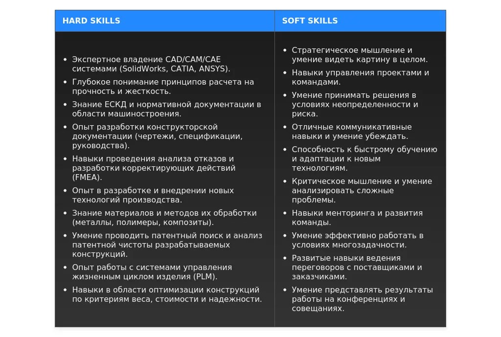 - Для вакансий, связанных с проектированием: "Разработка конструкторской документации", "Проектирование деталей и узлов", "Создание 3D-моделей", "Проведение расчетов на прочность".