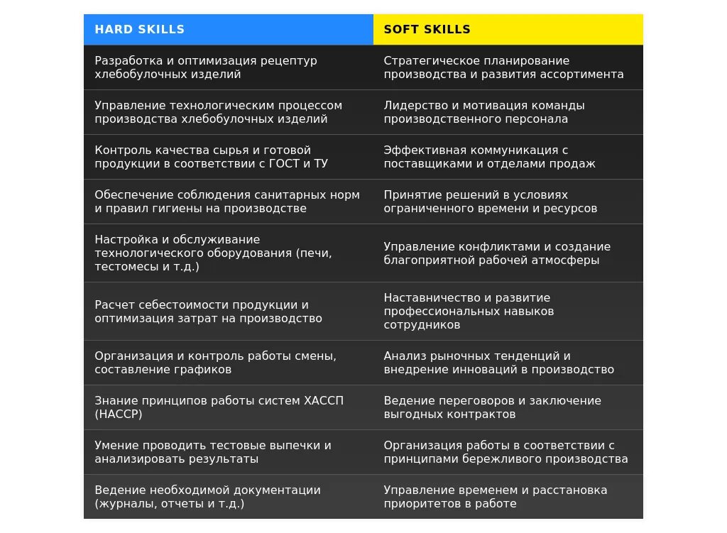 Профессиональные навыки: *Знание технологии производства крафтового хлеба*, *разработка новых рецептур*, *работа с заквасками и натуральными ингредиентами*, *контроль качества продукции*, *соблюдение санитарных норм*. Навыки управления: *Управление командой пекарей*, *обучение и мотивация персонала*, *планирование производства*, *контроль затрат*. Личные качества: *Творческий подход*, *ответственность*, *пунктуальность*, *умение работать в команде*."