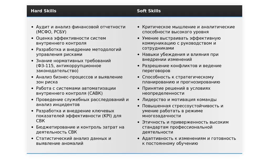 - Что обязательно включить:Ключевые навыки и компетенции, релевантные должности начальника службы внутреннего контроля (например, знание нормативной базы, опыт проведения аудитов, навыки управления рисками).
