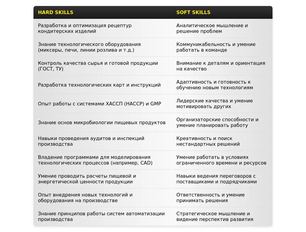 - На какие качества и навыки делать акцент: Внимание к деталям, умение работать в команде, аналитические способности, знание нормативной документации и стандартов в кондитерской промышленности.