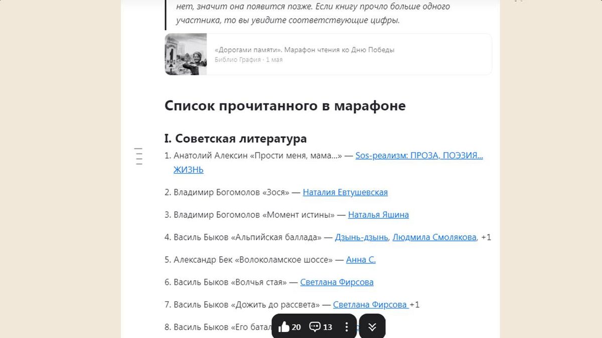 Дорогие друзья! Я опять поучаствовала в читательском марафоне, посвященном 80-летию Победы на канале Библио Графия. Про этот канал, набравший уже более 100 тысяч подписчиков (вот и не говорите, что «книжная» тема не популярна!), я неоднократно писала. Участники марафона читали и перечитывали книги отечественных и зарубежных писателей о Великой Отечественной и о Второй Мировой войне. Моя статья откликнется по ссылке: Отзыв написан как методическое вспоможение педагогу и библиотекарю и кому-то может оказаться полезным. А общие итоги марафона «Дорогами памяти» + отзывы о прочитанных книгах – смотрите здесь: https://dzen.ru/a/aDwbOpXu6A9slHas Здесь можно прочесть интересные статьи «книжных» блогеров, и прочувствовать общую атмосферу современной читающей аудитории. Всем мира и добра!