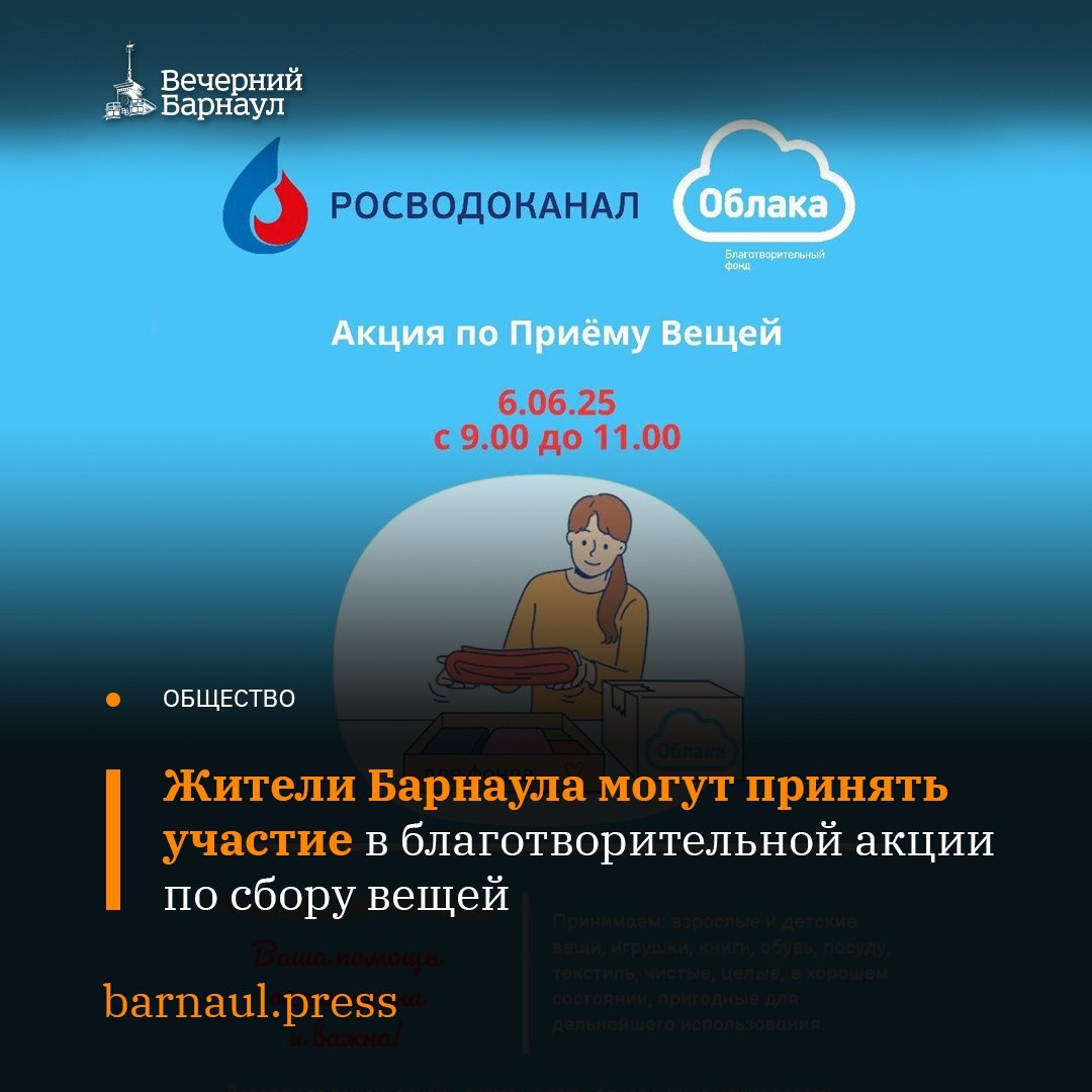 «Росводоканал Барнаул» и фонд «Облака» проведут благотворительную акцию по сбору вещей для нуждающихся семей края. Жители Барнаула могут принести взрослую и детскую одежду, игрушки, книги, обувь, посуду и текстиль. 📌 Мобильный пункт сбора вещей будет работать во фронт-офисе водоканала 6 июня с 9:00 до 11:00 на проспекте Калинина, 116 (холл 1-го этажа). Erid: 2SDnjdeHkMb. Реклама. Рекламодатель: ООО «БАРНАУЛЬСКИЙ ВОДОКАНАЛ», ИНН 2221064060. @barnaul