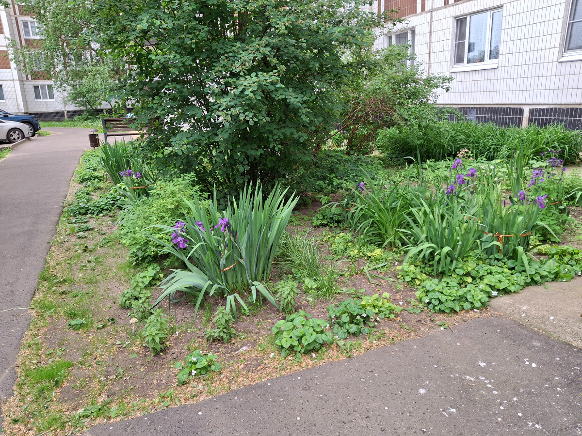 Вид на клумбу с одной стороны. Но цветоносы у ирисов, почему-то, падают. Подвязала их, как смогла. Цветет аквилегия. Три разных цвета. Между ирисами всходит космея. И сныть... Повсюду цветет белая фиалка. Справа флокс шиловидный. Белая фиалка растет вдоль тротуара. Следующий ряд - хосты. Отцвели белые нарциссы и розовые гиацинты. Надо бы полоть клумбу, но я столько разных семян закопала, боюсь выполоть, если что взошло. Например, обнаружила, что взошли лилии. Я по клумбе закопала черные горошины, что вызревают в пазухах листьев лилий. Зацвел лук декоративный. Было три цветка, один сорвали... Есть бутоны на пионах, вдруг зацветут. Пионам уже 3 года, еще не цвели ни разу. Вид на клумбу с другой стороны. Пересадила хосту, флокс, ромашку. Очень ждала дождя. И он пошел! :) В ночь с весны на лето был сильный дождь. И 1 июня днем несколько раз лил дождь. Полил все, что я посадила :)